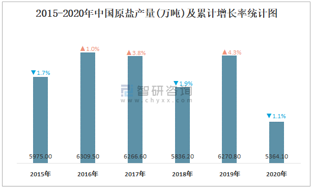 2015-2020年中國原鹽產量及累計增長率統計圖