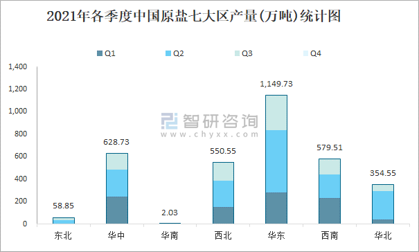 2021年各季度中國原鹽七大區產量統計圖