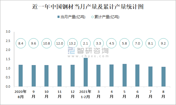 近一年中國鋼材當(dāng)月產(chǎn)量及累計產(chǎn)量統(tǒng)計圖