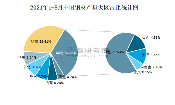 2021年1-8月中國鋼材產(chǎn)量大區(qū)占比統(tǒng)計圖