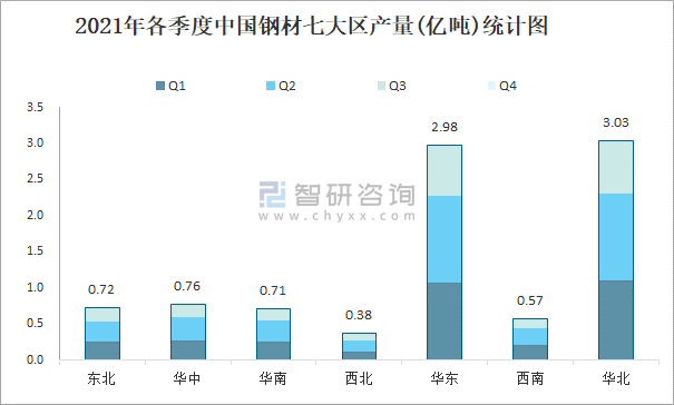 2021年各季度中國鋼材七大區(qū)產(chǎn)量統(tǒng)計圖