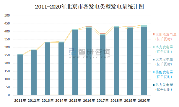 根據國家統計局數據統計可知:2011-2020年北京市發電量有所波動,總體呈現上升趨勢,從發電量類型來看,火力發電量占比最大(2020年占比為97.24%),且近10年有所波動,總體呈現上升趨勢;2011-2020年北京市電力消費量(實物量)有所波動,總體呈現下降趨勢,2015年-2016年之間增幅最大,為7.09%,2020年北京市電力消費量(實物量)達到1139.97億千瓦時。