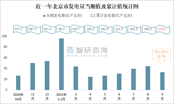 根據國家統計局數據統計可知:2021年9月北京市發電量為33.3億千瓦時,同比增長10.7%,2021年1-9月北京市發電量為339.5億千瓦時,累計增長8.3%;2021年1-9月北京市主要有3種類型發電量,發電量占全國比重約為0.56%,其中火力發電量為328.9億千瓦時,占北京市發電量比重約為96.88%,占全國發電量比重約為0.54%,是北京市最大發電量類型,目前北京市暫無風力發電量和核能發電量。