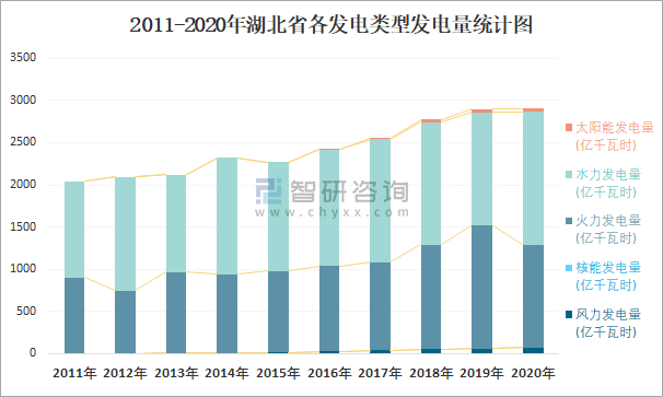 2011-2020年湖北省各發(fā)電類型發(fā)電量統(tǒng)計(jì)圖