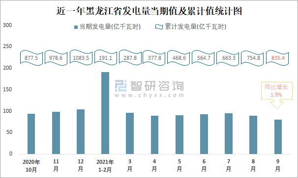 近一年黑龍江省發(fā)電量當(dāng)期值及累計(jì)值統(tǒng)計(jì)圖