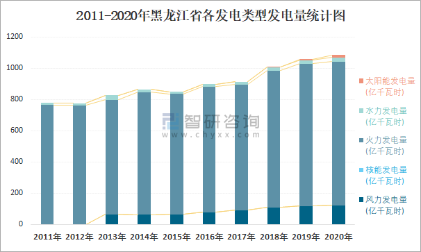 2011-2020年黑龍江省各發(fā)電類型發(fā)電量統(tǒng)計(jì)圖