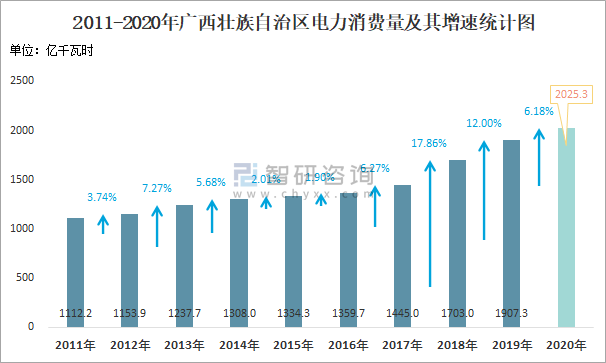 2011-2020年廣西壯族自治區電力消費量及其增速統計圖