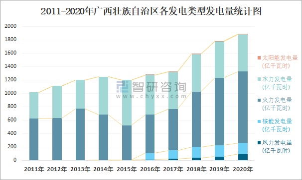 2011-2020年廣西壯族自治區各發電類型發電量統計圖