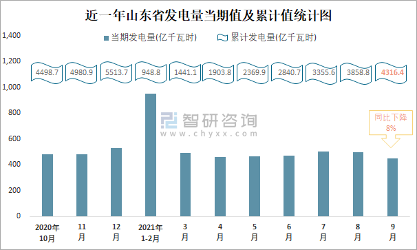 近一年山東省發電量當期值及累計值統計圖