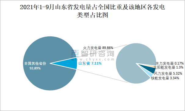2021年1-9月山東省發電量占全國比重及該地區各發電類型占比圖