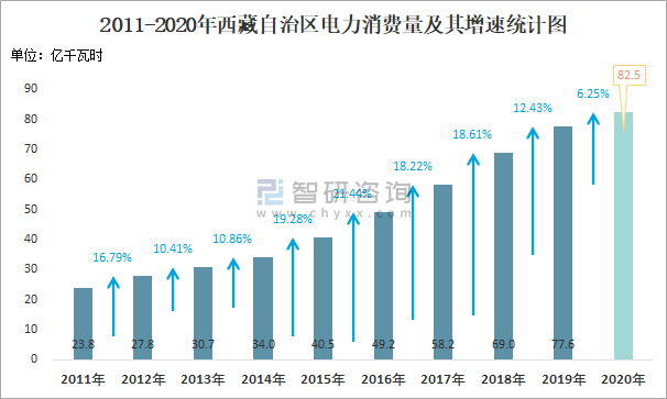 2011-2020年西藏自治區電力消費量及其增速統計圖