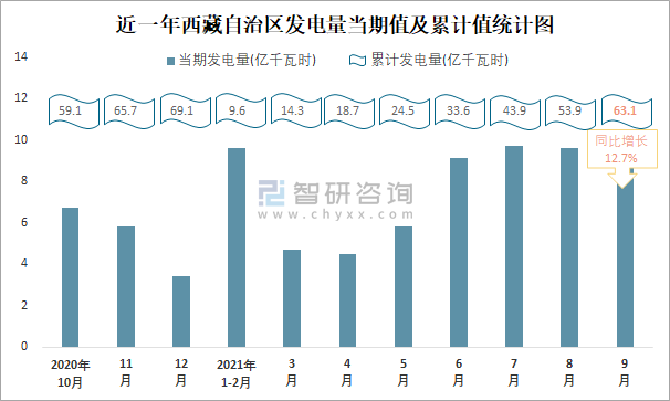近一年西藏自治區發電量當期值及累計值統計圖
