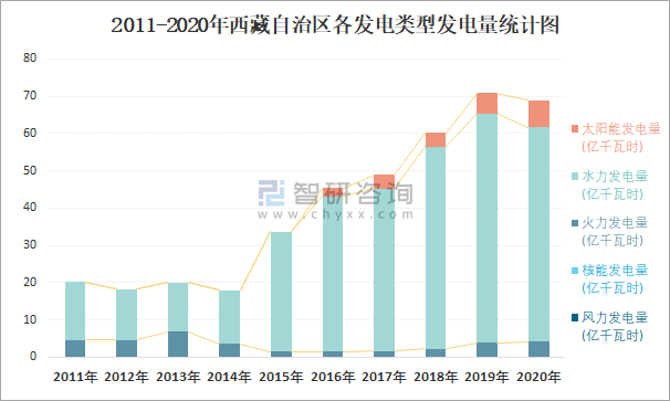 2011-2020年西藏自治區各發電類型發電量統計圖