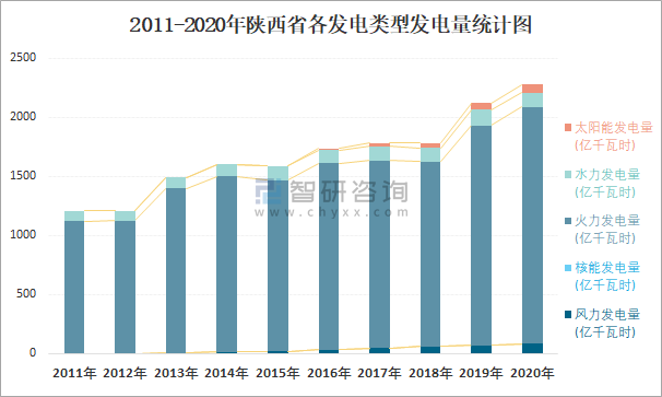 根據國家統計局數據統計可知:2011-2020年陜西省發電量有所波動,總體呈現上升趨勢,從發電量類型來看,火力發電量占比最大(2020年占比為88.17%),且近10年有所波動,總體呈現上升趨勢;2011-2020年陜西省電力消費量(實物量)有所波動,總體呈現下降趨勢,2018年-2019年之間增幅最大,為19.96%,2020年陜西省電力消費量(實物量)達到1740.9億千瓦時。