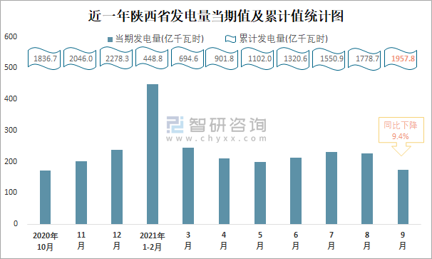 根據國家統計局數據統計可知:2021年9月陜西省發電量為173.4億千瓦時,同比下降9.4%,2021年1-9月陜西省發電量為1957.8億千瓦時,累計增長15.3%;2021年1-9月陜西省主要有4種類型發電量,發電量占全國比重約為3.22%,其中火力發電量為1712.7億千瓦時,占陜西省發電量比重約為87.48%,占全國發電量比重約為2.82%,是陜西省最大發電量類型,目前陜西省暫無核能發電量。