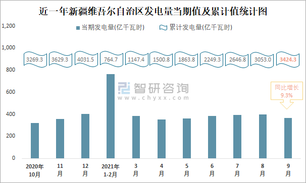 近一年新疆維吾爾自治區發電量當期值及累計值統計圖