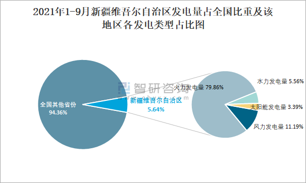 2021年1-9月新疆維吾爾自治區發電量占全國比重及該地區各發電類型占比圖