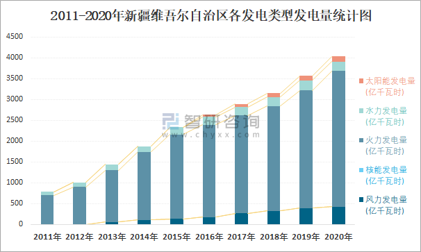 2011-2020年新疆維吾爾自治區各發電類型發電量統計圖