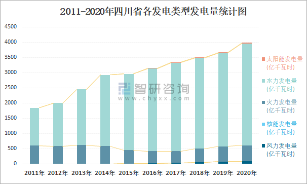 根據國家統計局數據統計可知:2011-2020年四川省發電量逐年遞增,從發電量類型來看,水力發電量占比最大(2020年占比為84.13%),且近10年逐年遞增;2011-2020年四川省電力消費量(實物量)有所波動,總體呈現上升趨勢,2017年-2018年之間增幅最大,為11.53%,2020年四川省電力消費量(實物量)達到2865.2億千瓦時。