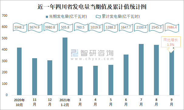 2021年1-9月四川省發電量為2986.4億千瓦時 以水力發電量為主(占比79.92%)