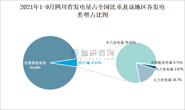 2021年1-9月四川省發電量占全國比重及該地區各發電類型占比圖