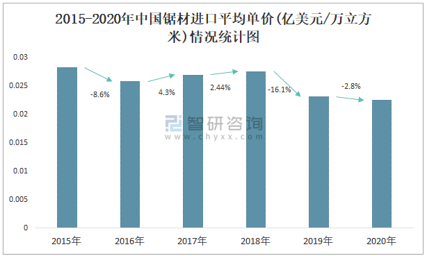 2015-2020年中國鋸材進口平均單價(億美元/萬立方米)情況統計圖