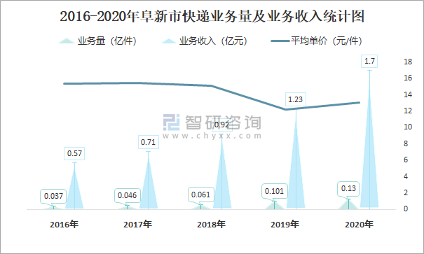 2016-2020年阜新市快遞業(yè)務(wù)量及業(yè)務(wù)收入統(tǒng)計(jì)圖