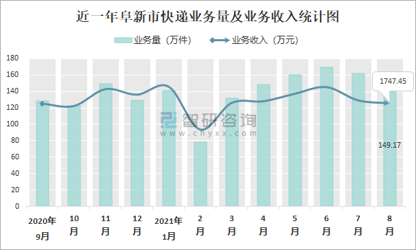 近一年阜新市快遞業(yè)務(wù)量及業(yè)務(wù)收入統(tǒng)計(jì)圖