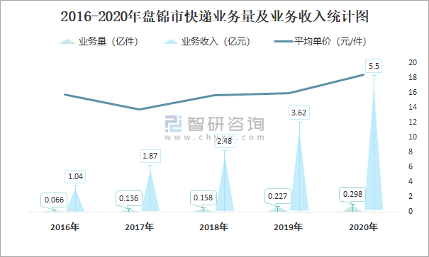 2016-2020年盤錦市快遞業務量及業務收入統計圖