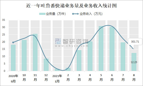 近一年吐魯番快遞業務量及業務收入統計圖