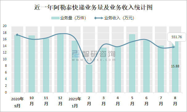 2021年8月阿勒泰快遞業務量與業務收入分別為15.88萬件和551.76萬元