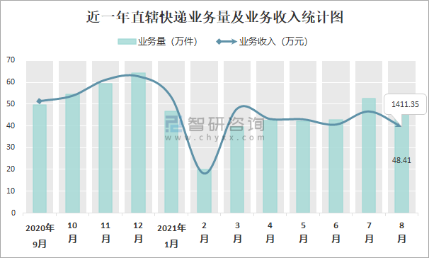 根據(jù)各省市郵政局?jǐn)?shù)據(jù)可知:2021年8月直轄快遞業(yè)務(wù)量為48.41萬(wàn)件,業(yè)務(wù)收入為1411.35萬(wàn)元;2021年1-8月直轄快遞累計(jì)業(yè)務(wù)量為334.49萬(wàn)件,同比增長(zhǎng)84.32%,累計(jì)業(yè)務(wù)收入為11857.86萬(wàn)元,同比增長(zhǎng)60.78%。