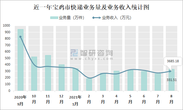 近一年寶雞市快遞業(yè)務(wù)量及業(yè)務(wù)收入統(tǒng)計(jì)圖