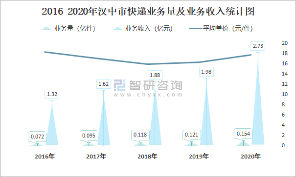 2016-2020年漢中市快遞業務量及業務收入統計圖