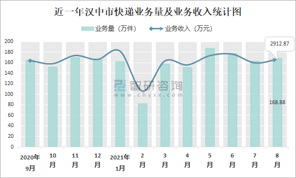 根據各省市郵政局數據可知:2021年8月漢中市快遞業務量占陜西快遞業務量的1.65%,陜西快遞業務量占全國快遞業務量的1.17%;2021年8月漢中市快遞業務收入占陜西快遞業務收入的2.82%,陜西快遞業務收入占全國快遞業務收入的1.26%。