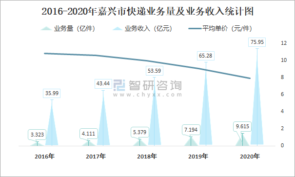 根據(jù)各省市郵政局數(shù)據(jù)可知:2021年8月嘉興市快遞業(yè)務(wù)量為8408.8萬件,業(yè)務(wù)收入為70861萬元;2021年1-8月嘉興市快遞累計業(yè)務(wù)量為68250.6萬件,同比增長42.5%,累計業(yè)務(wù)收入為562400萬元,同比增長37.6%;2016-2020年嘉興市快遞業(yè)務(wù)量與業(yè)務(wù)收入均逐年遞增,平均單價逐年遞減。