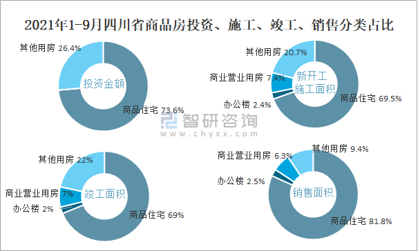 2021年1-9月四川省商品房投資、施工、竣工、銷售分類占比