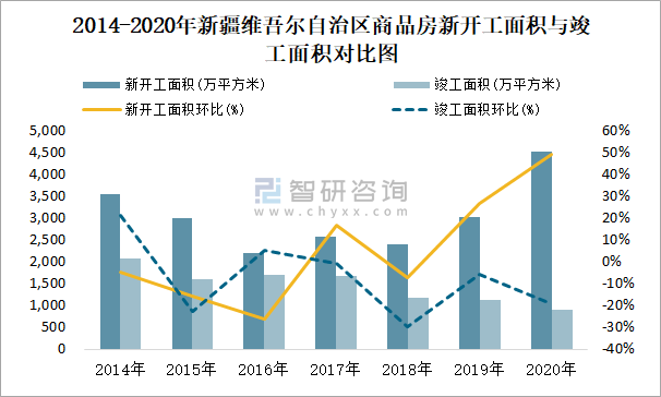 2014-2020年新疆維吾爾自治區商品房新開工面積與竣工面積對比圖
