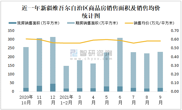 根據國家統計局數據統計可知:2021年9月新疆維吾爾自治區商品房銷售面積為227.37萬平方米(其中銷售現房21.15萬平方米,期房206.22萬平方米),銷售額為132.02億元,銷售均價約為0.58萬元/平方米;2021年1-9月新疆維吾爾自治區商品房累計銷售面積為1693.84萬平方米,銷售面積累計同比增長55.4%,累計銷售額為978.54億元,銷售額累計同比增長54.6%;2014-2020年新疆維吾爾自治區商品房總銷售面積2020年達到最高值,此后有所下滑,其中期房銷售面積大大高于現房銷售面積,銷售均價2019年達到最高值,此后有所下滑。