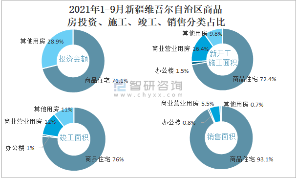 根據國家統計局數據統計可知:2021年1-9月新疆維吾爾自治區房地產開發企業在商品住宅中投資金額占比為71.1%(注:只有投資金額中其他用房包含辦公樓、商業營業用房),商品住宅的新開工面積與竣工面積所占比重差異不大,從銷售面積來看,商品住宅為銷售主力(占比高達93.1%),辦公樓銷售面積占比少于商業營業用房銷售面積占比。
