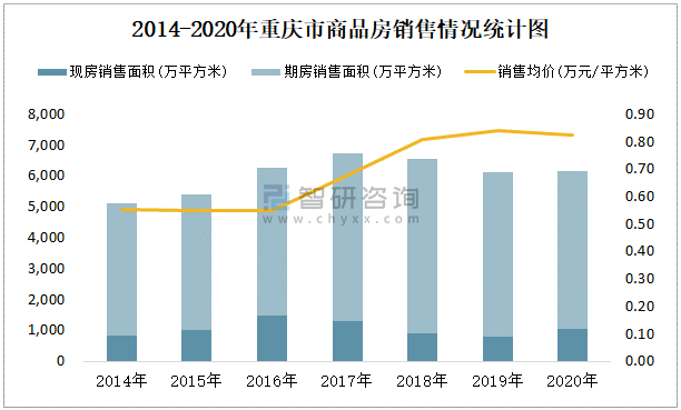 根據國家統計局數據統計可知:2021年9月重慶市商品房銷售面積為608.3萬平方米(其中銷售現房169.23萬平方米,期房439.07萬平方米),銷售額為511.33億元,銷售均價約為0.84萬元/平方米;2021年1-9月重慶市商品房累計銷售面積為4763.7萬平方米,銷售面積累計同比增長10.3%,累計銷售額為4265.66億元,銷售額累計同比增長22.8%;2014-2020年重慶市商品房總銷售面積2017年達到最高值,此后有所下滑,其中期房銷售面積大大高于現房銷售面積,銷售均價2019年達到最高值,此后有所下滑。