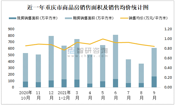 近一年重慶市商品房銷售面積及銷售均價統計圖