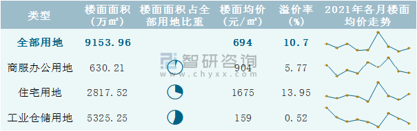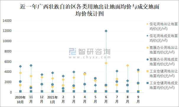 根據國信房地產信息網數據統計可知:2021年9月廣西壯族自治區全部用地出讓地面均價為1468元/㎡,其中住宅用地出讓地面均價最高(4121元/㎡),全部用地成交地面均價為812元/㎡,其中住宅用地成交地面均價為4453元/㎡,高于商服辦公用地成交地面均價;2021年1-9月廣西壯族自治區工業倉儲用地樓面面積占其全部用地比重最多,為58.17%,溢價率為0.52%。