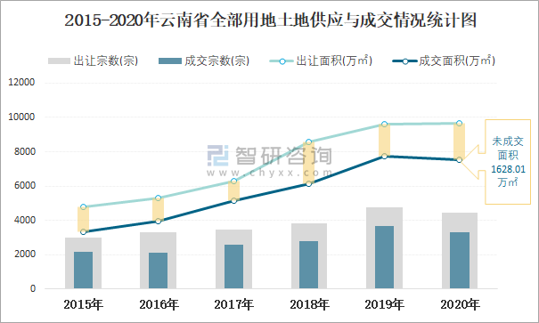 2015-2020年云南省全部用地土地供應(yīng)與成交情況統(tǒng)計(jì)圖