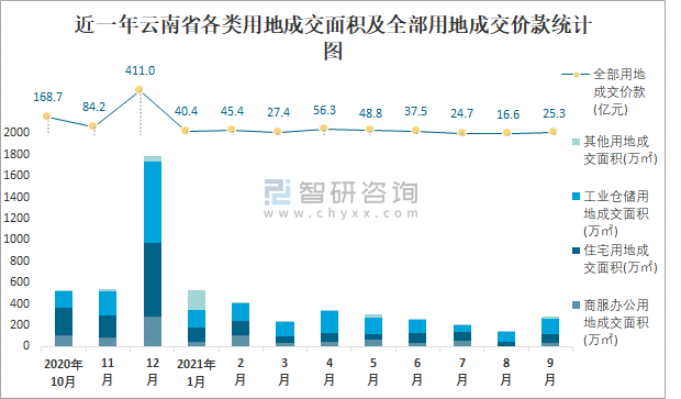 近一年云南省各類用地成交面積及全部用地成交價(jià)款統(tǒng)計(jì)圖