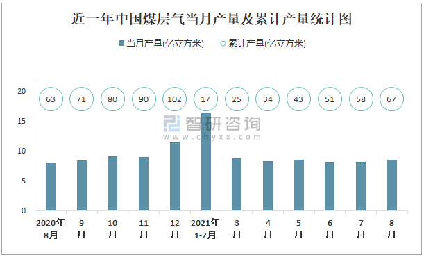 根據國家統計局數據顯示:2021年8月中國煤層氣產量為8.5億立方米,同比增長8.5%;2021年1-8月中國煤層氣累計產量為67億立方米,累計增長9%;2015-2020年中國煤層氣產量2017年起逐年遞增,2020年達到最高。