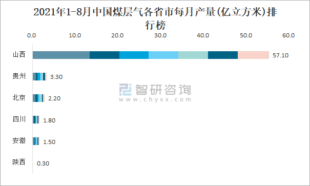 2021年1-8月中國煤層氣各省市每月產量排行榜