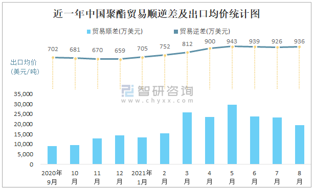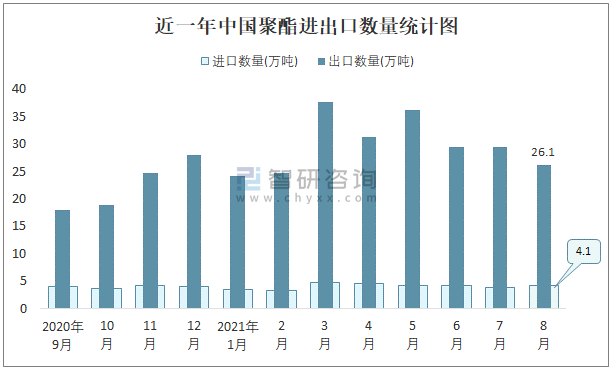 根據中國石油和化學工業聯合會數據顯示:2021年8月中國聚酯進口數量為4.1萬噸,出口數量為26.1萬噸;進口金額為4913萬美元,出口金額為24440萬美元;近一年中國聚酯出口總金額大于進口總金額,貿易順差為主,8月出口均價936美元/噸。