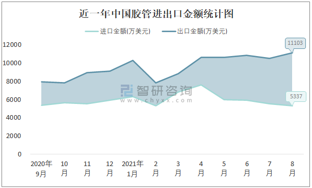 根據中國石油和化學工業聯合會數據顯示:2021年8月中國膠管進口數量為0.3萬噸,出口數量為2.3萬噸;進口金額為5337萬美元,出口金額為11103萬美元;近一年中國膠管出口總金額大于進口總金額,貿易順差為主,8月出口均價4827美元/噸。