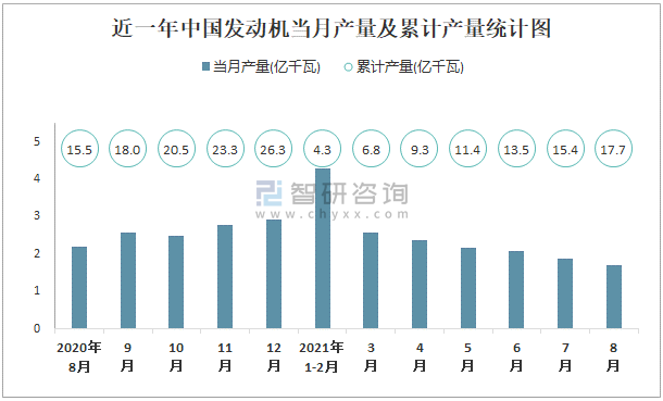 根據(jù)國(guó)家統(tǒng)計(jì)局?jǐn)?shù)據(jù)顯示:2021年8月中國(guó)發(fā)動(dòng)機(jī)產(chǎn)量為1.7億千瓦,同比下降27.7%;2021年1-8月中國(guó)發(fā)動(dòng)機(jī)累計(jì)產(chǎn)量為17.7億千瓦,累計(jì)增長(zhǎng)6.6%;2015-2020年中國(guó)發(fā)動(dòng)機(jī)產(chǎn)量2018年達(dá)到最高,此后逐年遞減。